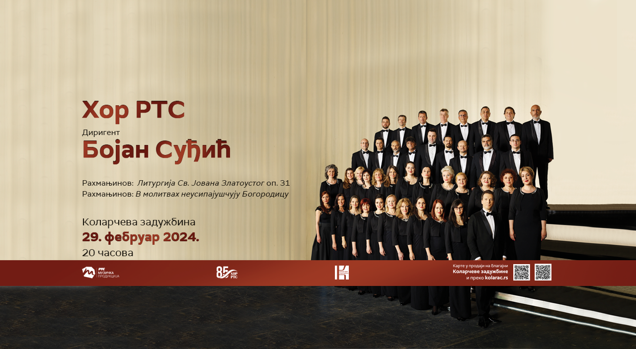 RTS choir and conductor Bojan Suđić invite you to a concert evening of spiritual music by Sergei Rachmaninoff. The program includes the Liturgy of St. John Chrysostom op. 31, which is often compared to his symphonic creations and the spiritual prayer V molitvah neusïpayushchuyu Bogoroditsu, dedicated to the feast of the Assumption of the Most Holy Theotokos. The concert will be held in Kolarac Concert Hall on Thursday, February 29, starting at 8 p.m. Tickets are on sale at the box office of the Kolarac Endowment and via kolarac.rs