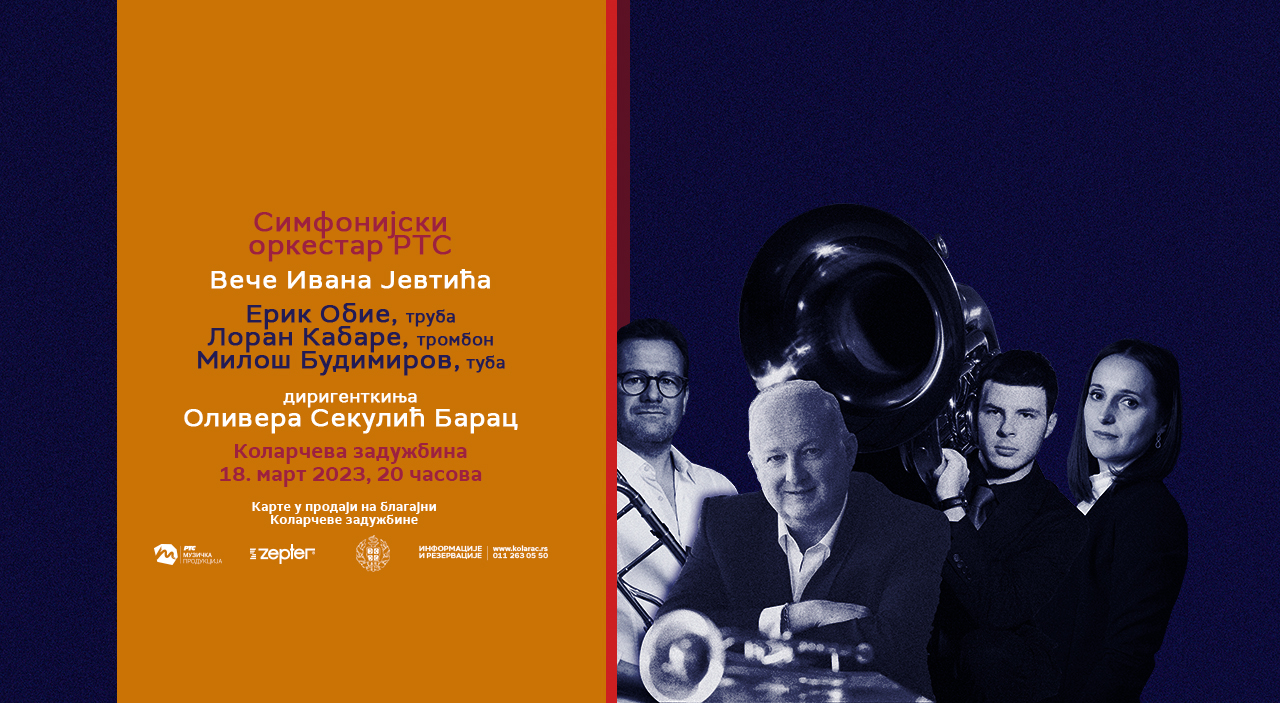 Pozivamo vas na autorsko veče kompozitora Ivana Jevtića! Ovo je prilika da čujete neka od najznačajnijih dela iz opusa tog stvaraoca, pisana za limene duvačke instrumente – „Prvi koncert za trubu i orkestar“, „Koncert za tubu“ i „Dupli koncert za trubu i trombon“. Prisustvujte i svetskoj premijeri „Koncerta za trombon i veliki gudački orkestar“. Uz Simfonijski orkestar RTS i dirigentkinju Oliveru Sekulić Barac, na koncertu će nastupiti i eminentni solisti Erik Obie, truba, Loran Kabare, trombon i Miloš Budimirov, tuba.